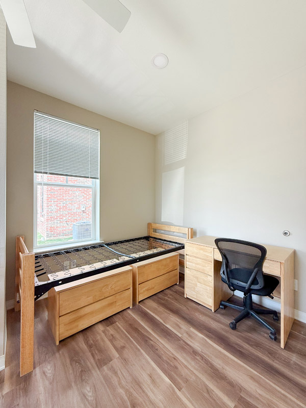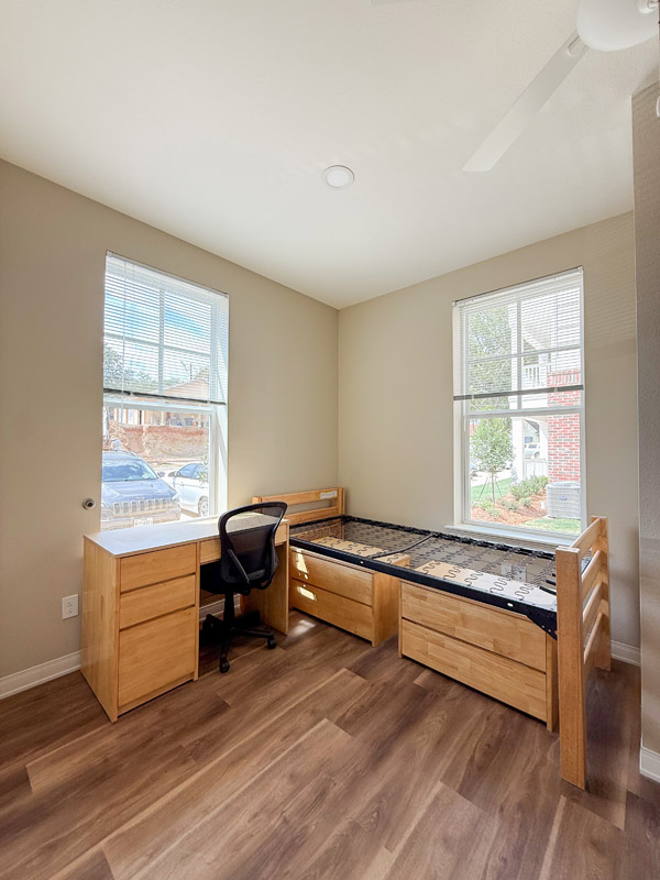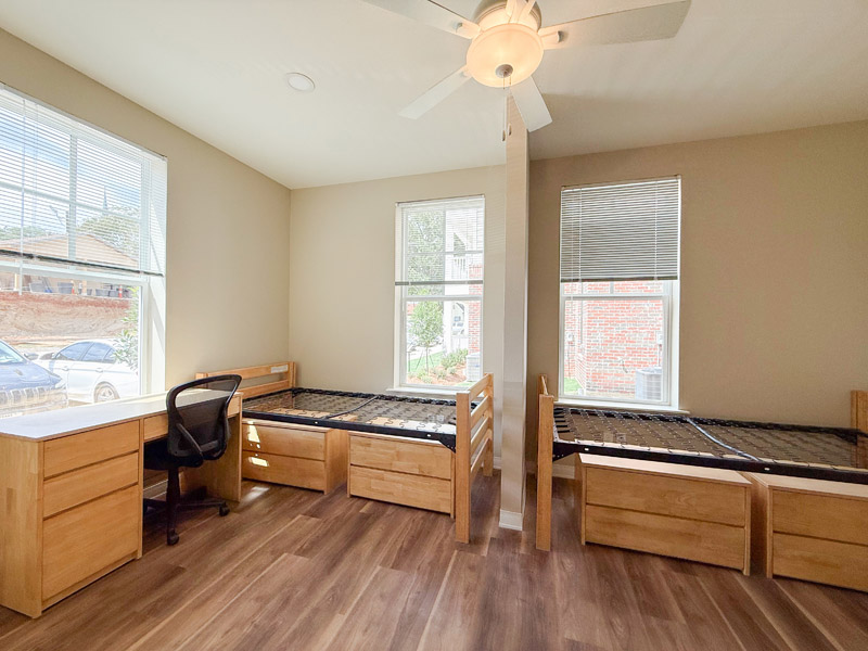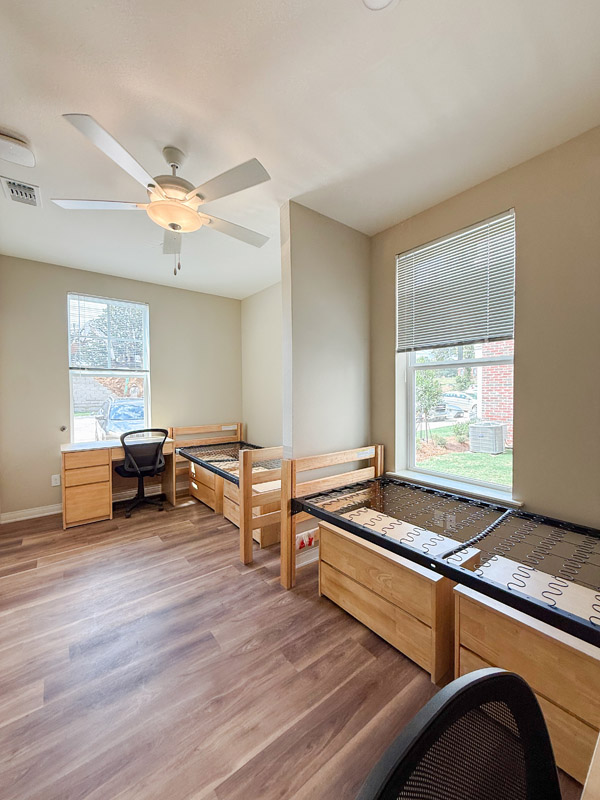 Located behind Centenary Square on Kings Highway in Shreveport, LA, Bicentennial Village is now complete. The project features four three-story buildings arranged around a shared plaza, with each floor designed as a six-bedroom unit offering private and shared rooms, three bathrooms, full-sized kitchen appliances, a washer and dryer, and an additional mini-fridge in each bedroom. The first floor of each building was built to be fully accessible for students with mobility needs.